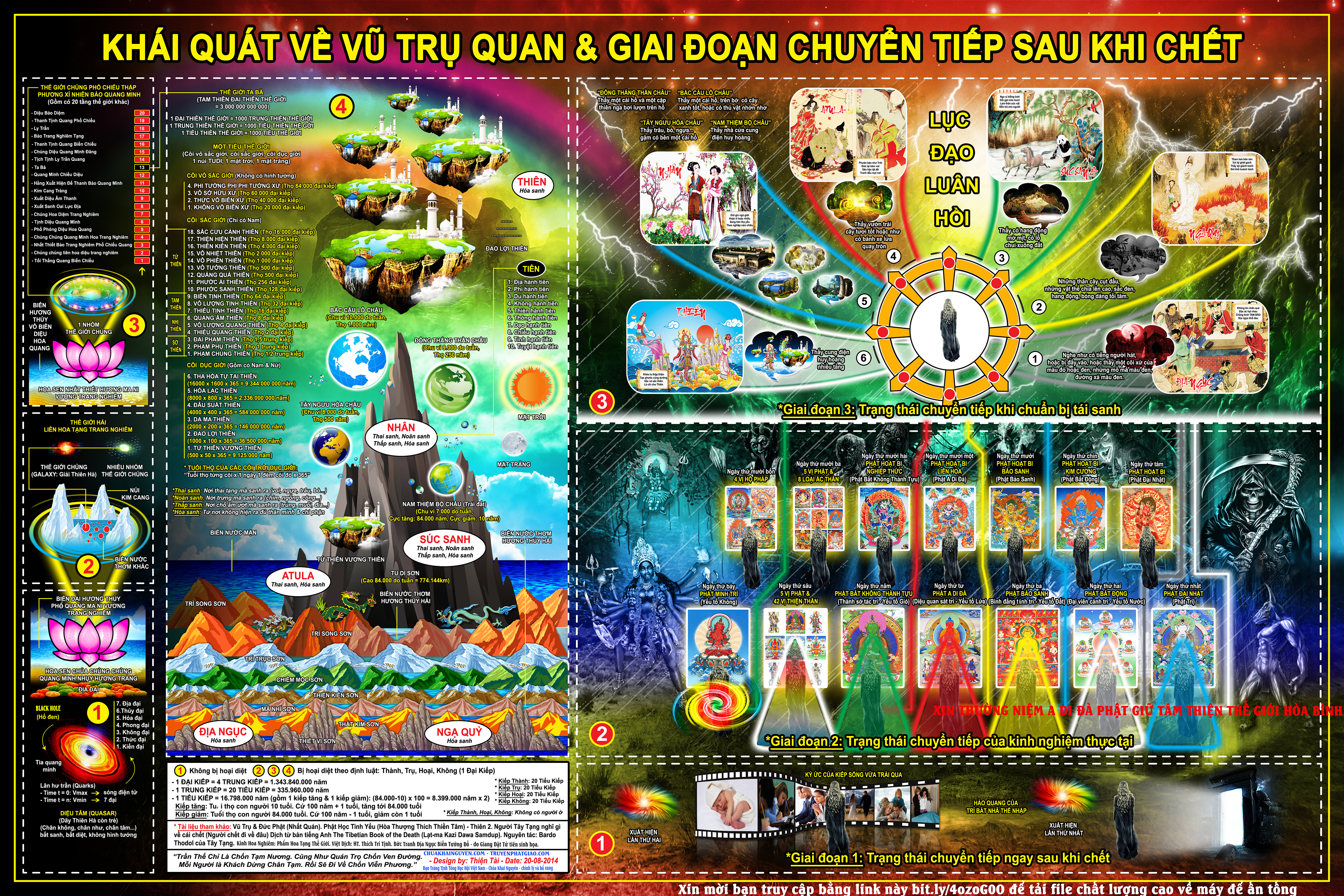 Tam thiên đại thiên thế giới: Hệ thống vũ trụ gồm một tiểu thế giới (trái đất), 1.000 tiểu thế giới là Tiểu thiên thế giới, 1.000 Tiểu thiên là Trung thiên, và 1.000 Trung thiên là Đại thiên thế giới (Tam thiên đại thiên thế giới).